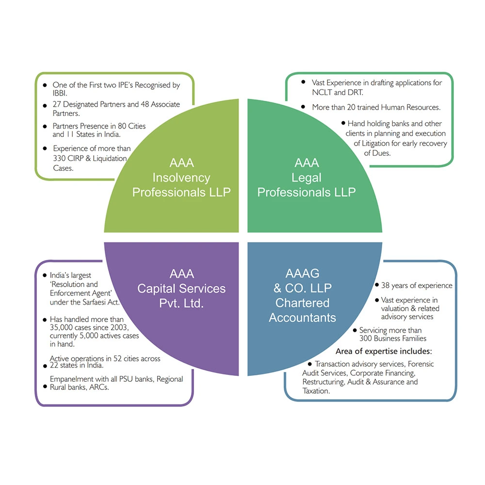 - AAA Group comprises various professionals which includesChartered Accountants, Lawyers, Company Secretaries, Engineers, MBS’s, Ex Bankers, Insolvency Professionals & Valuers.
